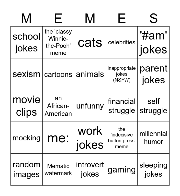 This bingo card has a free space and 24 words: me:, Mematic watermark, animals, random images, '#am' jokes, school jokes, sexism, the 'classy Winnie-the-Pooh' meme, financial struggle, work jokes, inappropriate jokes (NSFW), movie clips, the 'indecisive button press' meme, millennial humor, cartoons, gaming, self struggle, cats, parent jokes, an African-American, sleeping jokes, mocking, celebrities and introvert jokes.
