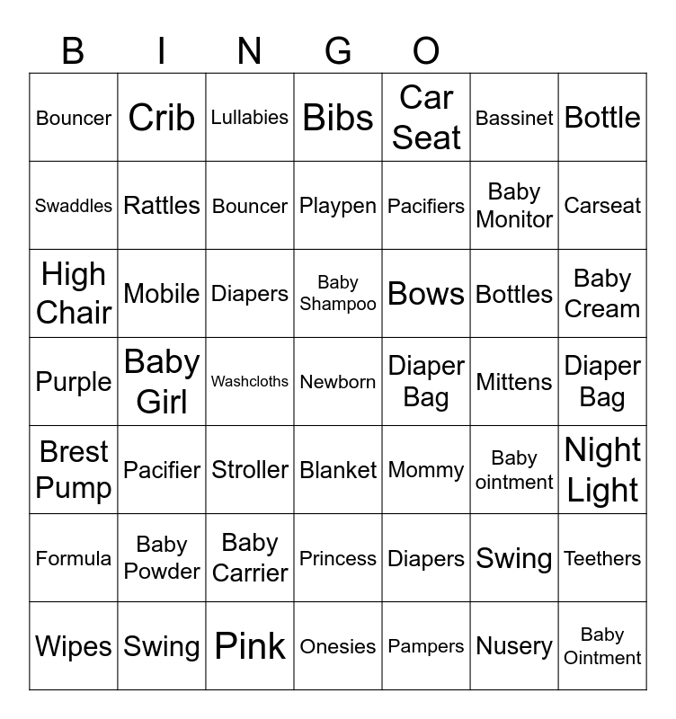 This bingo card has a free space and 48 words: Diapers, Baby Monitor, Onesies, Baby Girl, Diapers, Diaper Bag, Crib, Swing, Bassinet, Blanket, Bottle, Bibs, Bottles, Bows, Formula, Mittens, Swaddles, Carseat, Swing, Car Seat, Pacifiers, Washcloths, Bouncer, Rattles, Teethers, Bouncer, Baby Cream, Wipes, Baby Shampoo, Mobile, Nusery, Diaper Bag, Night Light, Baby Powder, Purple, Mommy, Baby ointment, High Chair, Stroller, Baby Carrier, Brest Pump, Baby Ointment, Lullabies, Pink, Playpen, Princess, Pacifier and Pampers.