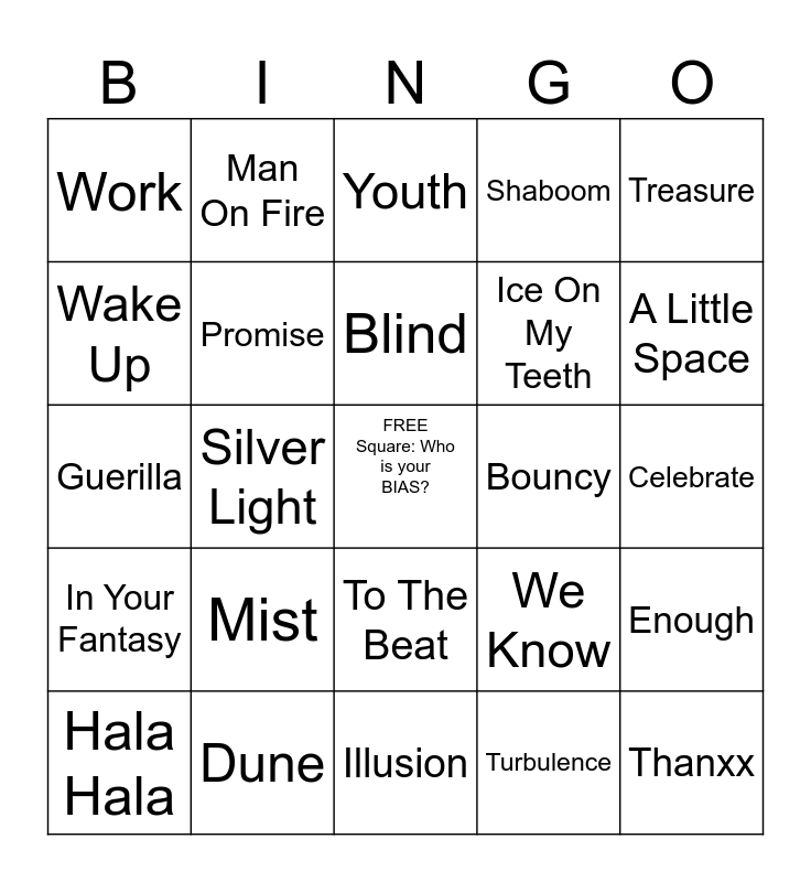 This bingo card has a free space and 29 words: Hala Hala, Take Me Home, Silver Light, Lemon Drop, Work, Youth, Promise, Mist, Bouncy, Dune, Celebrate, Thanxx, Illusion, Turbulence, A Little Space, Say My Name, To The Beat, In Your Fantasy, Treasure, Guerilla, We Know, Propaganda, Ice On My Teeth, Wake Up, Shaboom, Man On Fire, Enough, Blind and Fireworks.