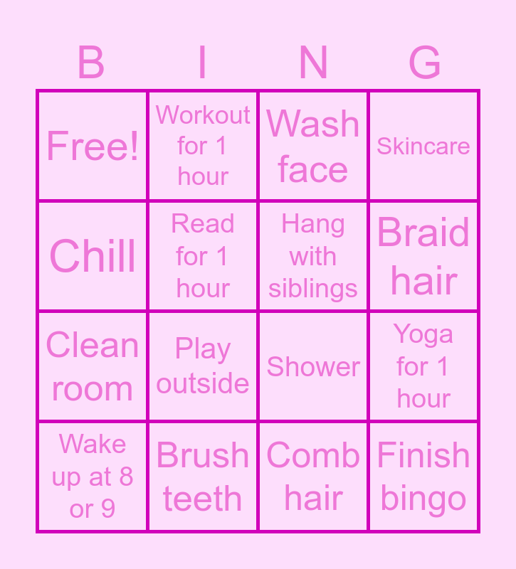 This bingo card has 16 words: Wake up at 8 or 9, Brush teeth, Wash face, Skincare, Chill, Workout for 1 hour, Shower, Yoga for 1 hour, Free!, Read for 1 hour, Comb hair, Braid hair, Clean room, Play outside, Hang with siblings and Finish bingo.