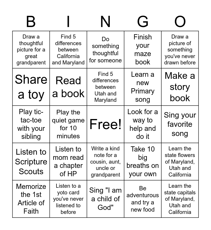 This bingo card has a free space and 24 words: Listen to mom read a chapter of HP, Listen to a yoto card you've never listened to before, Find 5 differences between Utah and Maryland, Memorize the 1st Article of Faith, Draw a picture of something you've never drawn before, Draw a thoughtful picture for a great grandparent, Share a toy, Find 5 differences between California and Maryland, Look for a way to help and do it, Write a kind note for a cousin, aunt, uncle or grandparent, Learn a new Primary song, Play tic-tac-toe with your sibling, Take 10 big breaths on your own, Learn the state flowers of Maryland, Utah and California, Read a book, Be adventurous and try a new food, Sing your favorite song, Do something thoughtful for someone, Make a story book, Play the quiet game for 10 minutes, Learn the state capitals of Maryland, Utah and California, Listen to Scripture Scouts, Finish your maze book and Sing "I am a child of God".