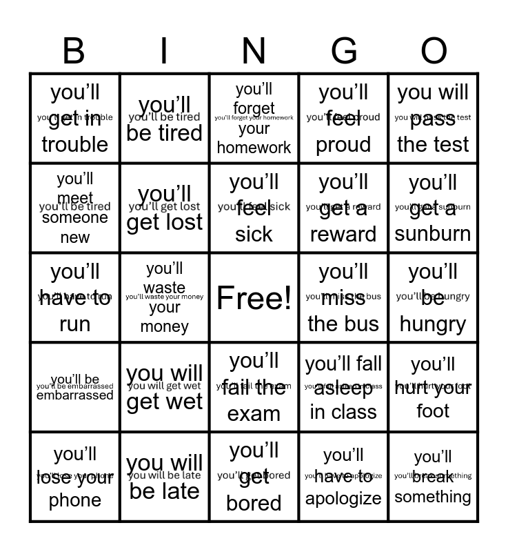 This bingo card has 24 images, a free space and 24 words: you will get wet, you will be late, you’ll feel sick, you’ll lose your phone, you will pass the test, you’ll get in trouble, you’ll meet someone new, you’ll be tired, you’ll miss the bus, you’ll fail the exam, you’ll get a reward, you’ll have to run, you’ll fall asleep in class, you’ll hurt your foot, you’ll get lost, you’ll have to apologize, you’ll be hungry, you’ll forget your homework, you’ll get a sunburn, you’ll waste your money, you’ll break something, you’ll be embarrassed, you’ll feel proud and you’ll get bored.