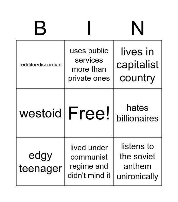 This bingo card has a free space and 8 words: hates billionaires, lives in capitalist country, uses public services more than private ones, edgy teenager, redditor/discordian, listens to the soviet anthem unironically, westoid and lived under communist regime and didn't mind it.