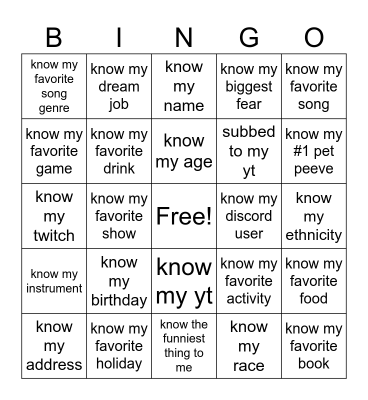 This bingo card has a free space and 24 words: know my birthday, know my favorite holiday, know my age, know my address, know my favorite song, know my favorite song genre, know my favorite game, know my dream job, know my discord user, know my yt, subbed to my yt, know my twitch, know my favorite activity, know my favorite food, know my favorite drink, know my race, know my ethnicity, know my name, know my #1 pet peeve, know my favorite show, know my favorite book, know my instrument, know my biggest fear and know the funniest thing to me.