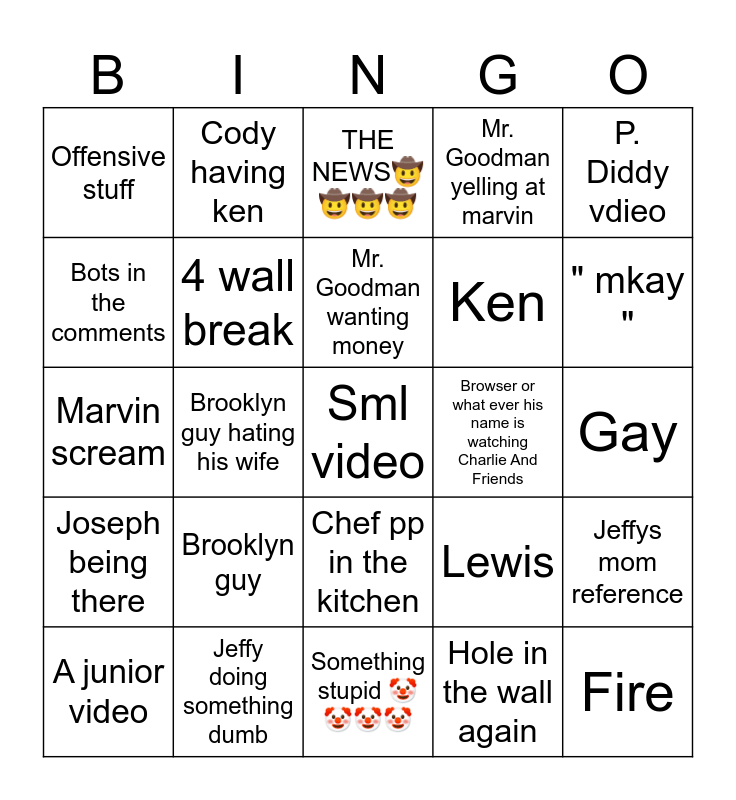 This bingo card has a free space and 24 words: Brooklyn guy, Jeffy doing something dumb, Mr. Goodman wanting money, A junior video, P. Diddy vdieo, Offensive stuff, Bots in the comments, Cody having ken, Browser or what ever his name is watching Charlie And Friends, Chef pp in the kitchen, Ken, Marvin scream, Lewis, Jeffys mom reference, 4 wall break, Hole in the wall again, Gay, THE NEWS🤠🤠🤠🤠, " mkay ", Brooklyn guy hating his wife, Fire, Joseph being there, Mr. Goodman yelling at marvin and Something stupid 🤡🤡🤡🤡.