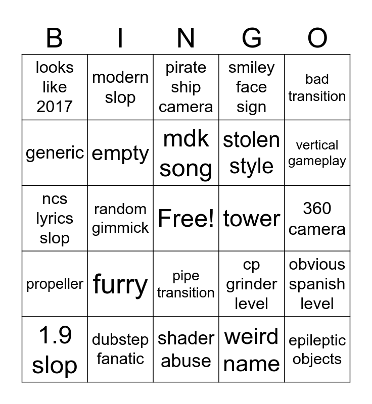 This bingo card has a free space and 24 words: furry, dubstep fanatic, mdk song, 1.9 slop, bad transition, looks like 2017, generic, modern slop, tower, pipe transition, stolen style, ncs lyrics slop, cp grinder level, obvious spanish level, empty, weird name, 360 camera, pirate ship camera, vertical gameplay, random gimmick, epileptic objects, propeller, smiley face sign and shader abuse.
