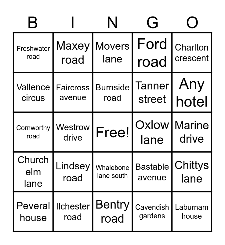 This bingo card has a free space and 55 words: Millard terrace, Peveral house, Gosfield road, Freshwater road, Bentry road, Highbridge road, Faircross avenue, Ripple road, Tanner street, Lynton road, Ford road, Broad street, Scholars way, Upney lane, Grafton road, Reede road, Charlton crescent, Westrow drive, Academy way, Laburnam house, Oxlow lane, Gale street, Bastable avenue, Movers lane, Fanshawe crescent, Burnside road, Cavendish gardens, Mallards road, Marine drive, Chittys lane, Lindisfarne road, Campden crescent, Wakering road, Merrielands crescent, Vallence circus, Cornworthy road, Stansgate road, Church elm lane, Sterry road, Bonham road, Maxey road, Sheppy road, Rose lane, Stanley avenue, Lindsey road, Ilchester road, Longbridge road, Porters avenue, Rainham road South, Any hotel, Billet road, High road, Whalebone lane north, Whalebone lane south and Any school.