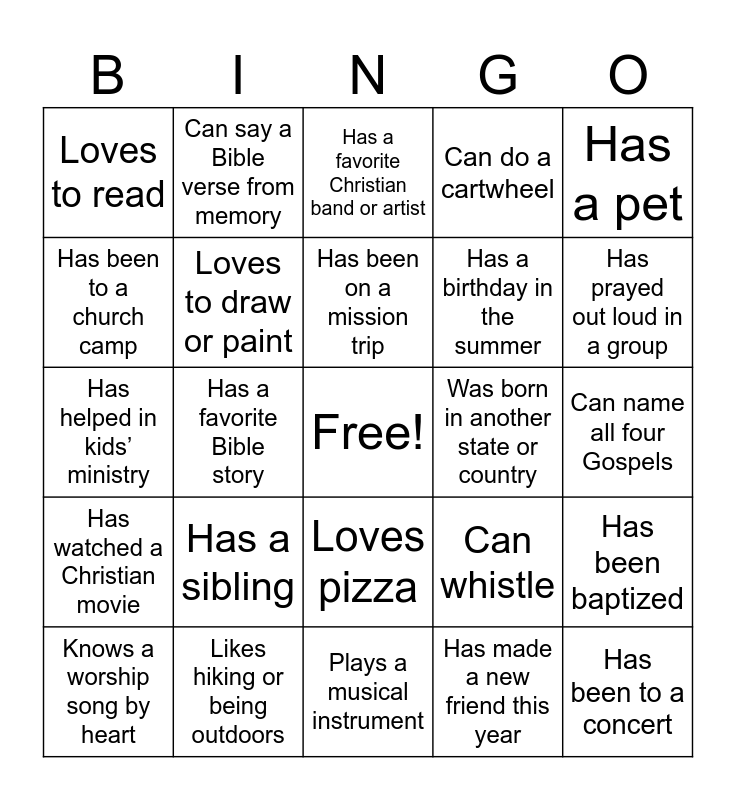 This bingo card has a free space and 25 words: Has a sibling, Plays a musical instrument, Has been on a mission trip, Knows a worship song by heart, Has a pet, Loves to read, Has been to a church camp, Can say a Bible verse from memory, Was born in another state or country, Loves pizza, Has a birthday in the summer, Has helped in kids’ ministry, Can whistle, Has been baptized, Loves to draw or paint, Has attended a youth group before, Can name all four Gospels, Has a favorite Christian band or artist, Has prayed out loud in a group, Has a favorite Bible story, Has been to a concert, Likes hiking or being outdoors, Has watched a Christian movie, Can do a cartwheel and Has made a new friend this year.