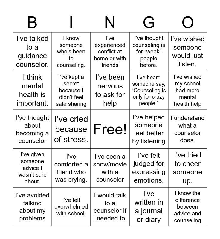 This bingo card has a free space and 24 words: I’ve comforted a friend who was crying., I’ve felt overwhelmed with school., I’ve been nervous to ask for help, I’ve avoided talking about my problems, I’ve wished someone would just listen., I’ve talked to a guidance counselor., I think mental health is important., I know someone who’s been to counseling., I’ve helped someone feel better by listening, I’ve seen a show/movie with a counselor, I’ve heard someone say, “Counseling is only for crazy people.”, I’ve thought about becoming a counselor, I’ve felt judged for expressing emotions., I’ve tried to cheer someone up., I’ve kept a secret because I didn’t feel safe sharing, I’ve written in a journal or diary, I understand what a counselor does., I’ve experienced conflict at home or with friends, I’ve wished my school had more mental health help, I’ve cried because of stress., I know the difference between advice and counseling, I’ve given someone advice I wasn’t sure about., I’ve thought counseling is for “weak” people before. and I would talk to a counselor if I needed to..