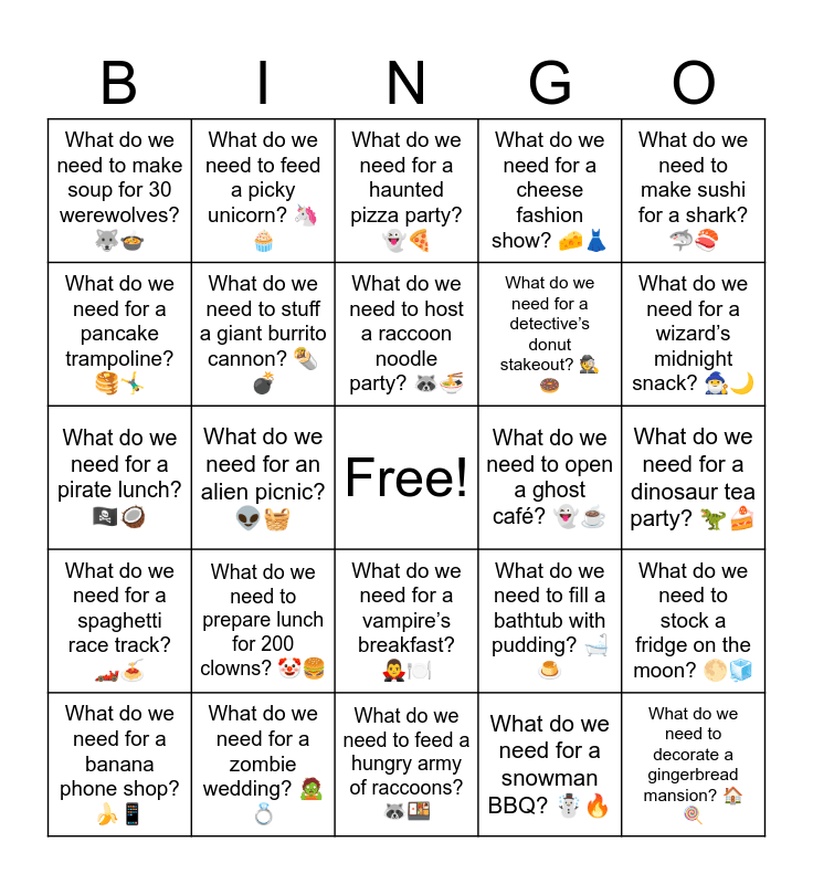 This bingo card has a free space and 30 words: What do we need for a zombie wedding? ๐ง๐, What do we need to feed a vegan crocodile? ๐๐ฅฌ, What do we need for an alien picnic? ๐ฝ๐งบ, What do we need to build a sandwich the size of a car? ๐๐ฅช, What do we need to make soup for 30 werewolves? ๐บ๐ฒ, What do we need for a haunted pizza party? ๐ป๐, What do we need to stuff a giant burrito cannon? ๐ฏ๐ฃ, What do we need for a vampireโs breakfast? ๐งโโ๏ธ๐ฝ๏ธ, What do we need to open a ghost cafรฉ? ๐ปโ, What do we need to feed a hungry army of raccoons? ๐ฆ๐ฑ, What do we need for a dinosaur tea party? ๐ฆ๐ฐ, What do we need to decorate a gingerbread mansion? ๐ ๐ญ, What do we need for a snowman BBQ? โ๏ธ๐ฅ, What do we need to bake a cake for a dragon? ๐๐, What do we need for a wizardโs midnight snack? ๐งโโ๏ธ๐, What do we need for a robot lunchbox? ๐ค๐ฅก, What do we need to fill a bathtub with pudding? ๐๐ฎ, What do we need for a spaghetti race track? ๐๏ธ๐, What do we need to prepare lunch for 200 clowns? ๐คก๐, What do we need to make sushi for a shark? ๐ฆ๐ฃ, What do we need for a pirate lunch? ๐ดโโ ๏ธ๐ฅฅ, What do we need for a fairy picnic? ๐งโโ๏ธ๐ฅ, What do we need to feed a picky unicorn? ๐ฆ๐ง, What do we need for a detectiveโs donut stakeout? ๐ต๏ธ๐ฉ, What do we need for a pancake trampoline? ๐ฅ๐คธโโ๏ธ, What do we need for a cheese fashion show? ๐ง๐, What do we need to stock a fridge on the moon? ๐๐ง, What do we need for a banana phone shop? ๐๐ฑ, What do we need to host a raccoon noodle party? ๐ฆ๐ and What do we need for a jellybean swimming pool? ๐โโ๏ธ๐ฌ.