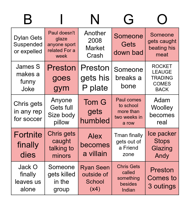 This bingo card has a free space and 24 words: Chris gets caught talking to minors, Someone gets killed in the group, Preston gets his P plate, Jack O finally leaves us alone, Someone gets caught beating his meat, Dylan Gets Suspended or expelled, James S makes a funny Joke, Paul doesn't glaze anyone sport related For a week, Paul comes to school more than two weeks in a row, Alex becomes a villain, Someone breaks a bone, Chris gets in any rep for soccer, Tman finally gets out of a Friend zone, Ice packer Stops Glazing Andy, Preston goes gym, Chris Gets called something besides Indian, Adam Woolley becomes real, Another 2008 Market Crash, ROCKET LEAUGE TRADING COMES BACK, Anyone Gets full Size body pillow, Preston Comes to 3 outings, Fortnite finally dies, Someone Gets down bad and Ryan Seen outside of School (x4).