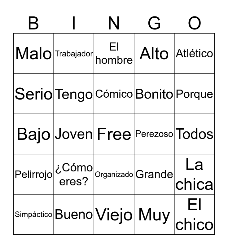 This bingo card has a free space and 24 words: ¿Cómo eres?, Bueno, Cómico, Simpáctico, Atlético, Malo, Serio, Trabajador, Perezoso, Organizado, Bonito, Bajo, Grande, La chica, Tengo, Muy, Todos, El hombre, Porque, Joven, El chico, Pelirrojo, Alto and Viejo.