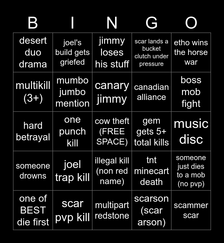 This bingo card has a free space and 24 words: joel trap kill, scar pvp kill, canary jimmy, one of BEST die first, etho wins the horse war, desert duo drama, multikill (3+), joel's build gets griefed, gem gets 5+ total kills, illegal kill (non red name), canadian alliance, hard betrayal, tnt minecart death, someone just dies to a mob (no pvp), mumbo jumbo mention, scarson (scar arson), music disc, jimmy loses his stuff, boss mob fight, one punch kill, scammer scar, someone drowns, scar lands a bucket clutch under pressure and multipart redstone.