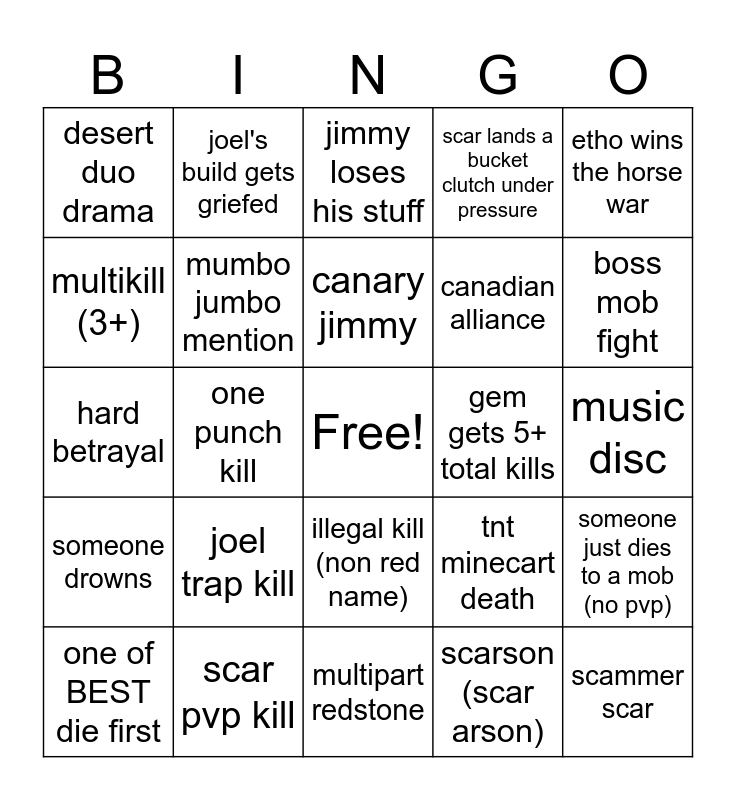 This bingo card has a free space and 24 words: joel trap kill, scar pvp kill, canary jimmy, one of BEST die first, etho wins the horse war, desert duo drama, multikill (3+), joel's build gets griefed, gem gets 5+ total kills, illegal kill (non red name), canadian alliance, hard betrayal, tnt minecart death, someone just dies to a mob (no pvp), mumbo jumbo mention, scarson (scar arson), music disc, jimmy loses his stuff, boss mob fight, one punch kill, scammer scar, someone drowns, scar lands a bucket clutch under pressure and multipart redstone.