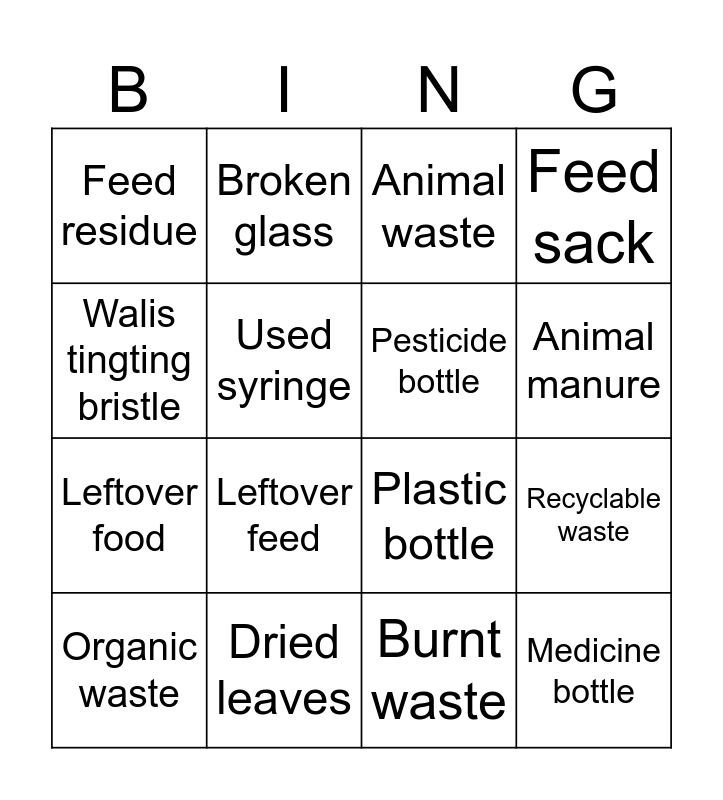 This bingo card has 29 words: Free!, Segregation, Recyclable waste, Non-biodegradable waste, Feed residue, Animal waste, Pesticide bottle, Fluorescent bulb, Dried leaves, Mixed waste, Burnt waste, Organic waste, Worn-out slipper, Cardboard box, Leftover feed, Broken plate, Foil, Medicine bottle, Walis tingting bristle, Plastic bottle, Tin can, Compost, Leftover food, Used syringe, Feed sack, Broken glass, Paper, Animal manure and Plastic wrapper.