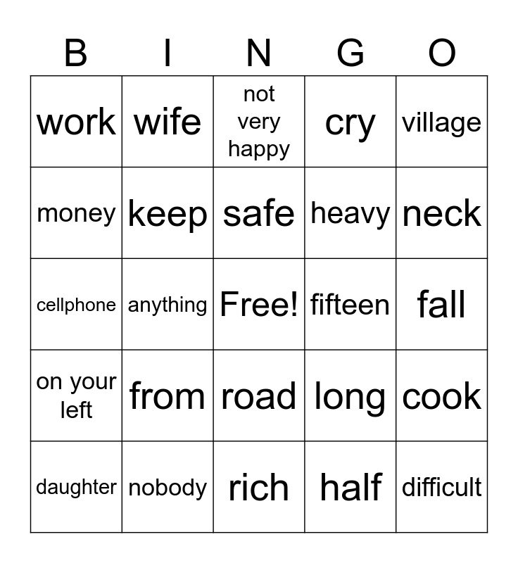 This bingo card has a free space and 40 words: carefully, cellphone, grandmother, keep, nobody, road, safe, tonight, village, on your left, anything, cry, difficult, fall, fifteen, from, time, work, yesterday, not very happy, cook, half, heavy, money, supper, their, vegetable, was, were, go into, about, daughter, husband, long, neck, rich, sign, son, wife and put on.