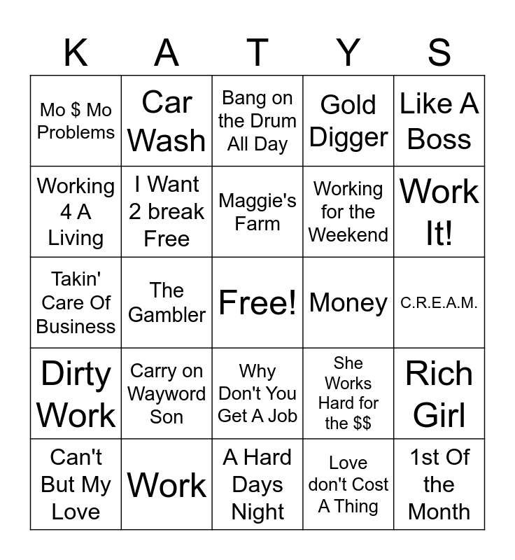 This bingo card has a free space and 27 words: She Works Hard for the $$, 9 to 5, Working for the Weekend, A Hard Days Night, Working 4 A Living, Bang on the Drum All Day, Car Wash, Dirty Work, Money, Rich Girl, Takin' Care Of Business, Gold Digger, Can't But My Love, Work, Work It!, Work Out, I Want 2 break Free, Maggie's Farm, Carry on Wayword Son, Mo $ Mo Problems, C.R.E.A.M., Love don't Cost A Thing, The Gambler, 1st Of the Month, Why Don't You Get A Job, Like A Boss and I Will Buy You a New LIfe.