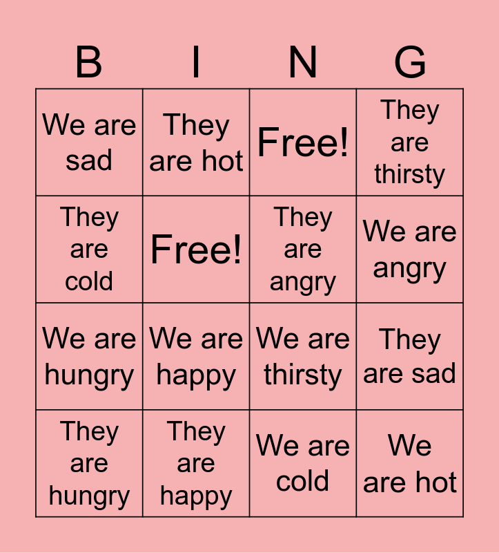 This bingo card has 16 words: They are happy, They are sad, Free!, We are sad, We are hungry, They are hot, We are thirsty, We are cold, They are cold, Free!, They are hungry, They are thirsty, We are happy, We are angry, They are angry and We are hot.