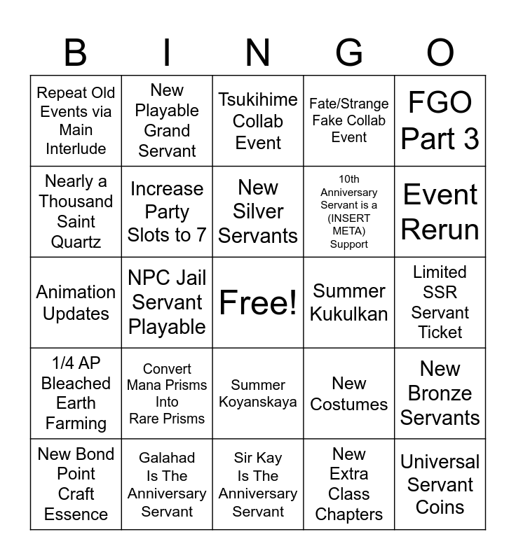 This bingo card has a free space and 24 words: Convert Mana Prisms Into Rare Prisms, Galahad Is The Anniversary Servant, New Silver Servants, New Bond Point Craft Essence, FGO Part 3, Repeat Old Events via Main Interlude, Nearly a Thousand Saint Quartz, New Playable Grand Servant, Summer Kukulkan, Summer Koyanskaya, 10th Anniversary Servant is a (INSERT META) Support, Animation Updates, New Costumes, New Bronze Servants, Increase Party Slots to 7, New Extra Class Chapters, Limited SSR Servant Ticket, Tsukihime Collab Event, Event Rerun, NPC Jail Servant Playable, Universal Servant Coins, 1/4 AP Bleached Earth Farming, Fate/Strange Fake Collab Event and Sir Kay Is The Anniversary Servant.