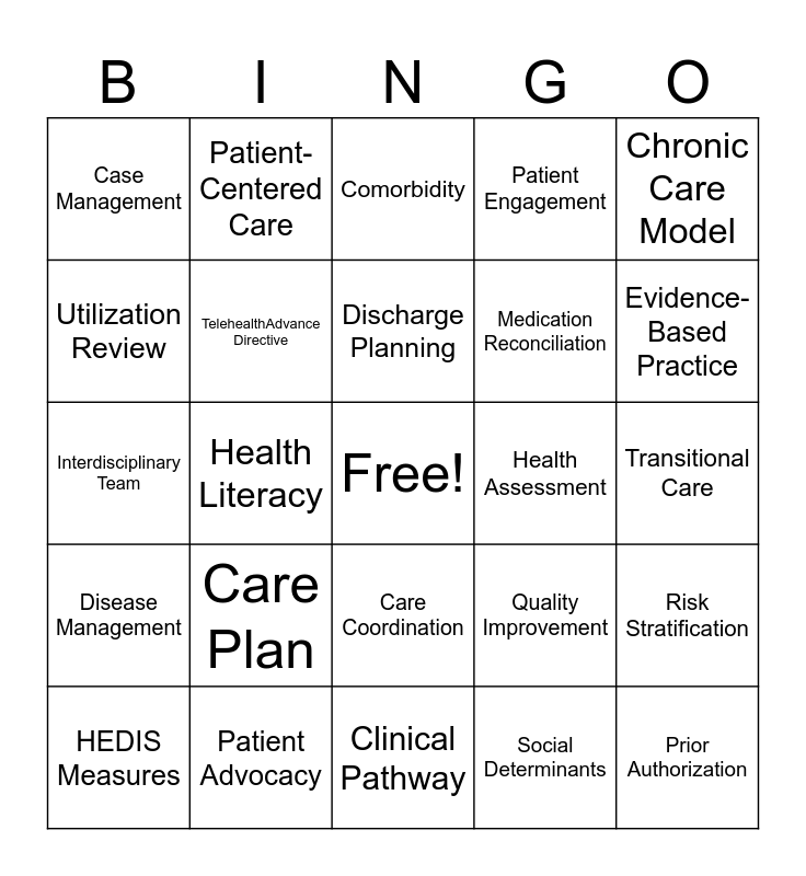 This bingo card has a free space and 24 words: Care Plan, Patient Advocacy, Discharge Planning, HEDIS Measures, Chronic Care Model, Case Management, Utilization Review, Patient-Centered Care, Health Assessment, Care Coordination, Medication Reconciliation, Interdisciplinary Team, Quality Improvement, Risk Stratification, TelehealthAdvance Directive, Social Determinants, Transitional Care, Comorbidity, Evidence-Based Practice, Health Literacy, Prior Authorization, Disease Management, Patient Engagement and Clinical Pathway.