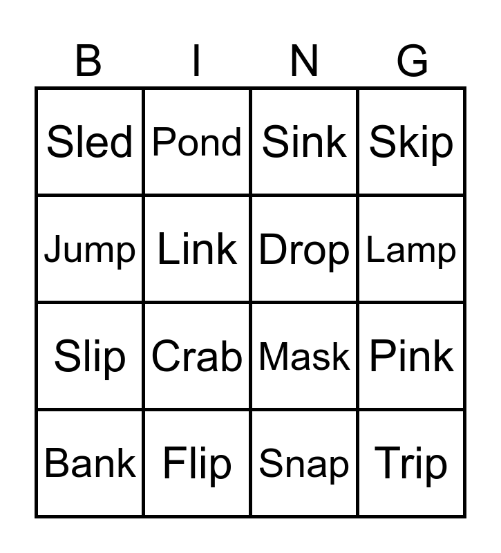 This bingo card has 16 words: Flip, Pink, Sink, Sled, Slip, Pond, Mask, Snap, Jump, Link, Bank, Skip, Crab, Lamp, Drop and Trip.