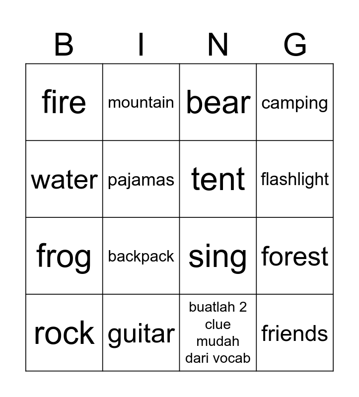 This bingo card has 17 words: buatlah 2 clue mudah dari vocab, rock, bear, fire, backpack, camping, forest, tent, flashlight, pajamas, guitar, sing, water, mountain, frog, bag and friends.