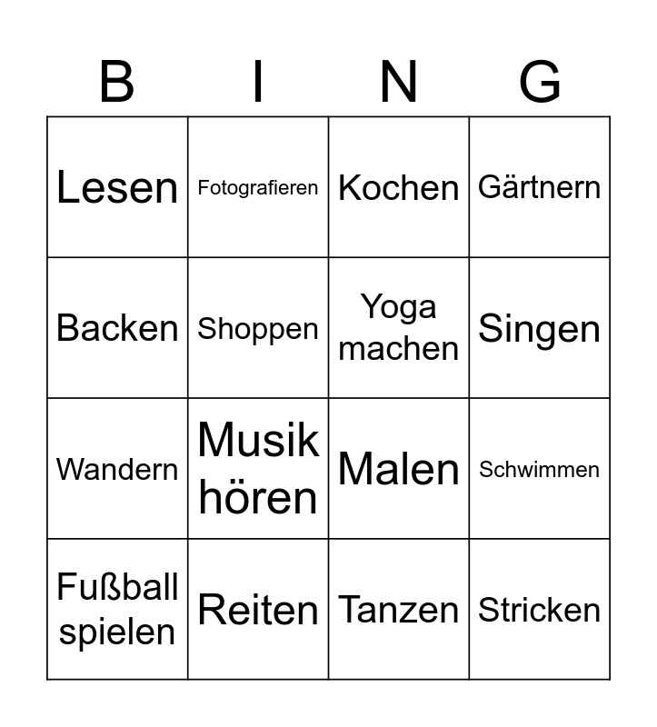 This bingo card has 16 words: Fußball spielen, Reiten, Kochen, Gärtnern, Backen, Fotografieren, Malen, Schwimmen, Lesen, Shoppen, Tanzen, Singen, Wandern, Musik hören, Yoga machen and Stricken.