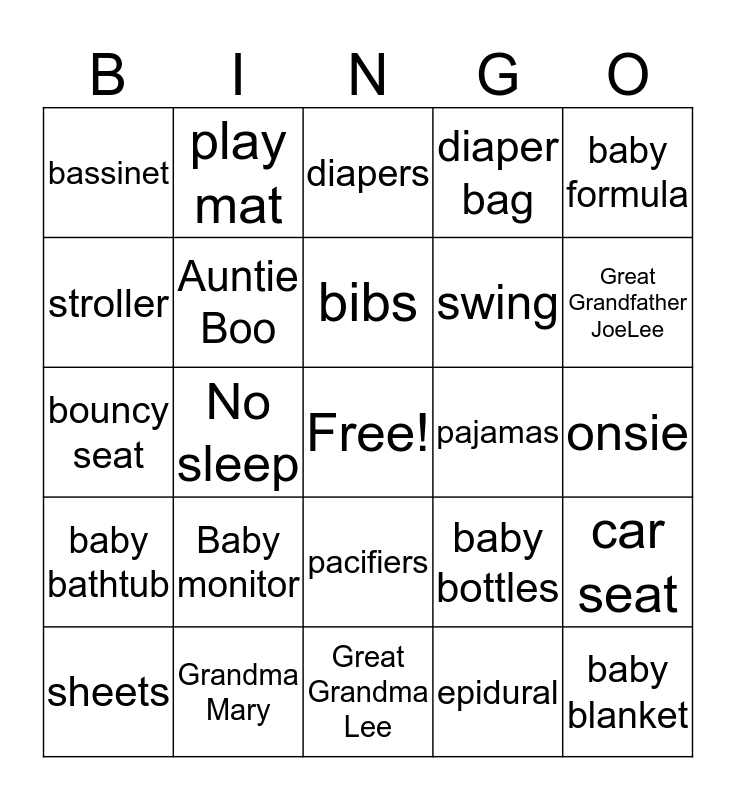This bingo card has a free space and 28 words: car seat, receiving blanket, swing, epidural, stroller, diapers, play mat, baby bathtub, pajamas, sheets, bouncy seat, diaper bag, Grandma Mary, Great Grandma Lee, Great Grandfather JoeLee, washcloths, Baby monitor, Auntie Boo, bibs, pacifiers, bassinet, baby carrier, baby blanket, No sleep, onsie, baby bottles, baby formula and diaper genie.