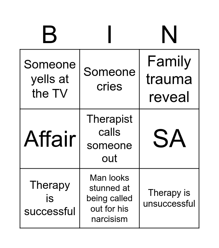 This bingo card has a free space and 8 words: SA, Family trauma reveal, Someone cries, Therapy is successful, Someone yells at the TV, Therapy is unsuccessful, Affair and Man looks stunned at being called out for his narcisism.