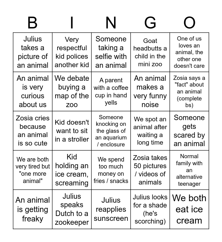 This bingo card has 25 words: Kid holding an ice cream, screaming, Julius reapplies sunscreen, A parent with a coffee cup in hand yells, An animal is getting freaky, One of us loves an animal, the other one doesn't care, Julius takes a picture of an animal, An animal is very curious about us, Very respectful kid polices another kid, We spot an animal after waiting a long time, We spend too much money on fries / snacks, An animal makes a very funny noise, Zosia cries because an animal is so cute, Zosia takes 50 pictures / videos of animals, Normal family with an alternative teenager, We debate buying a map of the zoo, We both eat ice cream, Someone gets scared by an animal, Someone taking a selfie with an animal, Zosia says a "fact" about an animal (complete bs), Kid doesn't want to sit in a stroller, Someone knocking on the glass of an aquarium / enclosure, Julius speaks Dutch to a zookeeper, We are both very tired but "one more animal", Goat headbutts a child in the mini zoo and Julius looks for a shade (he's scorching).