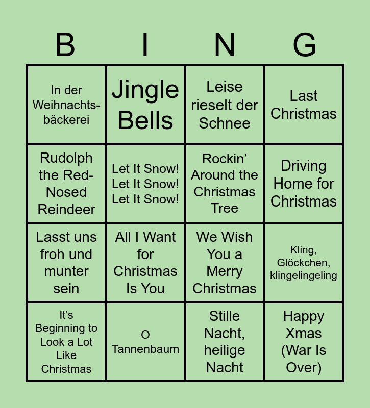 This bingo card has 16 words: O Tannenbaum, Kling, Glöckchen, klingelingeling, Leise rieselt der Schnee, In der Weihnachts-bäckerei, Lasst uns froh und munter sein, Jingle Bells, We Wish You a Merry Christmas, Stille Nacht, heilige Nacht, Rudolph the Red-Nosed Reindeer, Let It Snow! Let It Snow! Let It Snow!, It’s Beginning to Look a Lot Like Christmas, Last Christmas, All I Want for Christmas Is You, Driving Home for Christmas, Rockin’ Around the Christmas Tree and Happy Xmas (War Is Over).