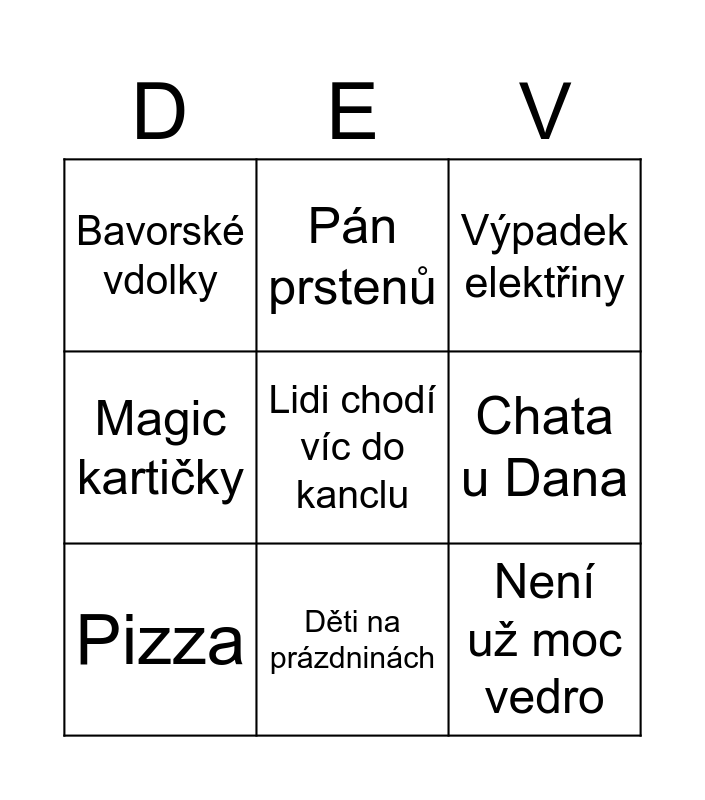 This bingo card has 9 words: Pizza, Výpadek elektřiny, Pán prstenů, Magic kartičky, Bavorské vdolky, Chata u Dana, Lidi chodí víc do kanclu, Není už moc vedro and Děti na prázdninách.