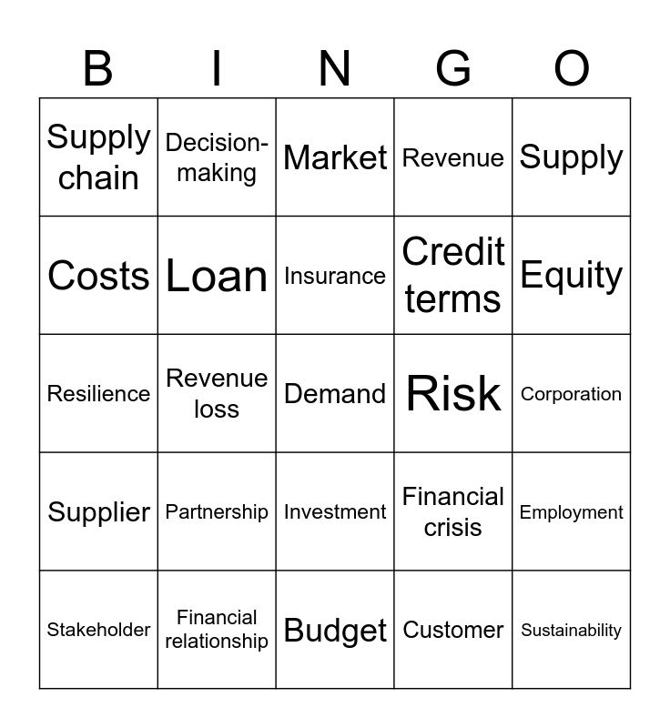 This bingo card has 60 words: Entity, Financial relationship, Interdependent, Supplier, Customer, Investor, Loan, Interest, Credit terms, Cash flow, Revenue, Profit, Costs, Expenses, Bankruptcy, Supply chain, Demand, Supply, Contract, Insurance, Risk, Market, Stakeholder, Employment, Wage, Salary, Asset, Liability, Equity, Balance sheet, Income statement, Economic event, Direct effect, Flow-on effect, Decision-making, Justification, Consequence, Revenue loss, Operational cost, Resilience, Diversification, Partnership, Corporation, Sole trader, Financial crisis, Supply disruption, Consumer confidence, Liquidity, Debt, Investment, Budget, Forecast, Economic growth, Inflation, Recession, Recovery, Competitive advantage, Productivity, Sustainability and Ethics.