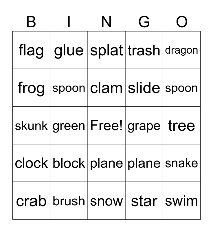 This bingo card has a free space and 24 words: block, brush, clam, crab, dragon, flag, frog, glue, grape, plane, slide, skunk, plane, snake, spoon, star, tree, splat, spoon, green, swim, clock, trash and snow.