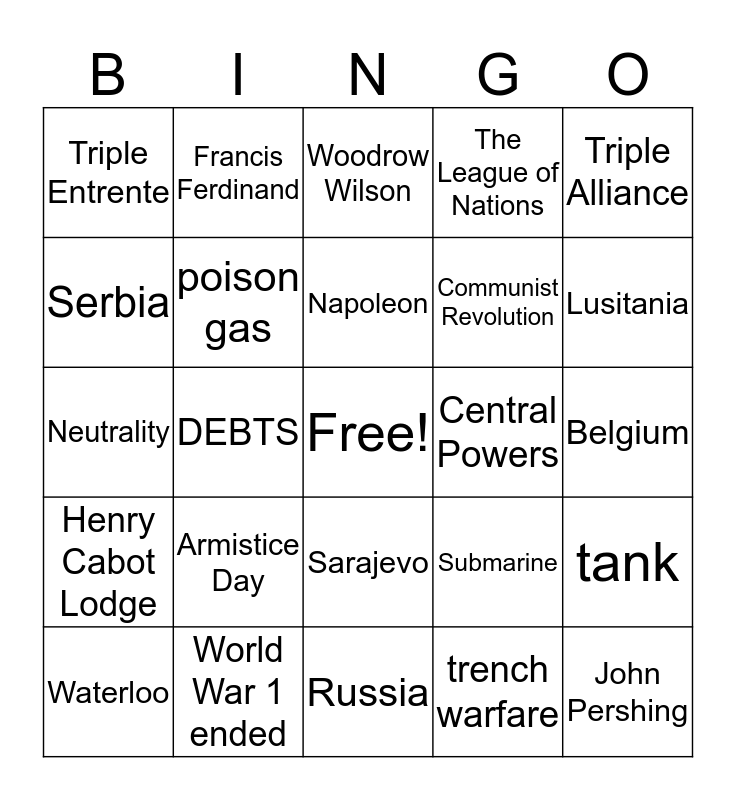 This bingo card has a free space and 24 words: Armistice Day, World War 1 ended, Napoleon, Waterloo, Triple Alliance, Triple Entrente, Serbia, Francis Ferdinand, Central Powers, Sarajevo, Communist Revolution, Neutrality, Submarine, tank, poison gas, trench warfare, Belgium, Woodrow Wilson, Lusitania, DEBTS, John Pershing, Henry Cabot Lodge, The League of Nations and Russia.
