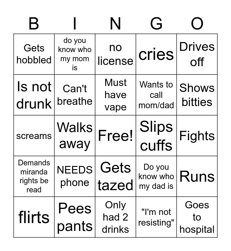 This bingo card has a free space and 27 words: Do you know who my dad is, "I'm not under arrest", Wants to call mom/dad, Only had 2 drinks, Is not drunk, no license, do you know who my mom is, Demands miranda rights be read, Slips cuffs, Runs, screams, cries, flirts, Pees pants, Shows bitties, Has to pee, Can't breathe, Must have vape, NEEDS phone, Gets hobbled, Fights, "I'm not resisting", Walks away, Goes to hospital, Gets tazed, Drives off and asleep in car.