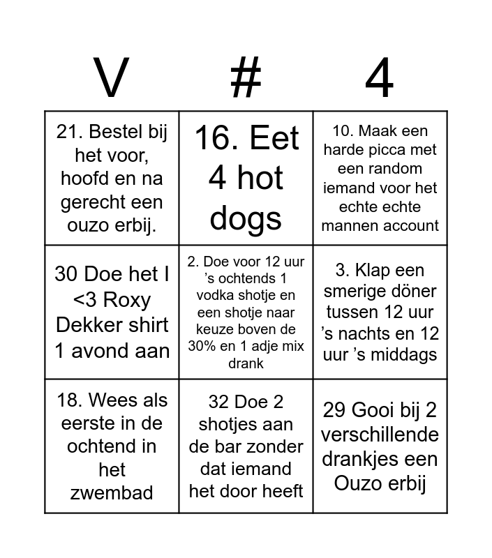 This bingo card has a free space and 8 words: 3. Klap een smerige döner tussen 12 uur ’s nachts en 12 uur ’s middags, 10. Maak een harde picca met een random iemand voor het echte echte mannen account, 16. Eet 4 hot dogs, 18. Wees als eerste in de ochtend in het zwembad, 21. Bestel bij het voor, hoofd en na gerecht een ouzo erbij., 29 Gooi bij 2 verschillende drankjes een Ouzo erbij, 30 Doe het I <3 Roxy Dekker shirt 1 avond aan and 32 Doe 2 shotjes aan de bar zonder dat iemand het door heeft.