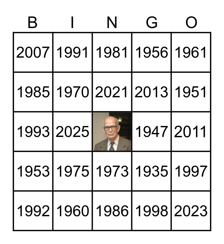 This bingo card has 1 images, a free space and 37 words: 1958, 1950, 1970, 1997, 1975, 2021, 2001, 1961, 2013, 2025, 1956, 2023, 2011, 1985, 1953, 1989, 1981, 1964, 1947, 2007, 1960, 1951, 1992, 1996, 1986, 1994, 1990, 1946, 1936, 1980, 1973, 1998, 1991, 1983, 1935, 1993 and 1968.