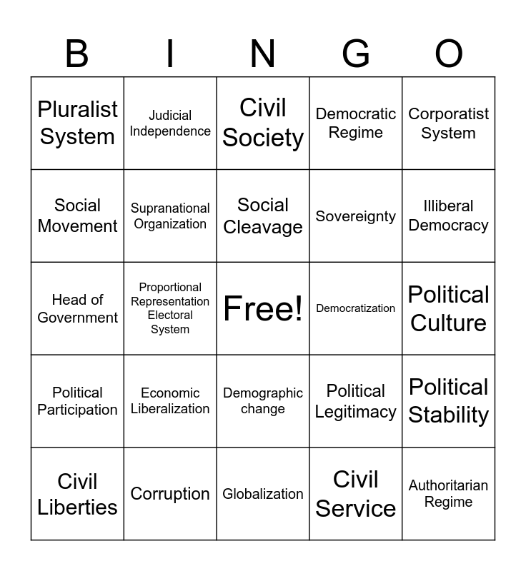 This bingo card has a free space and 43 words: Authority, Authoritarian Regime, Cabinet, Civil Liberties, Civil Rights, Civil Service, Civil Society, Consolidated Democracy, Corporatist System, Corruption, Democratic Regime, Democratization, Demographic change, Economic Liberalization, Federalism, Globalization, Government Transparency, Head of Government, Head of State, Illiberal Democracy, Judicial Independence, Parliamentary System, Party System, Pluralist System, Political Efficacy, Political Culture, Political Ideology, Political Institution, Political Legitimacy, Political Participation, Political Socialization, Political Stability, Presidential System, Proportional Representation Electoral System, Regime, Rule of law, Single-member district, Social Cleavage, Social Movement, Sovereignty, State, Supranational Organization and Unitary System.