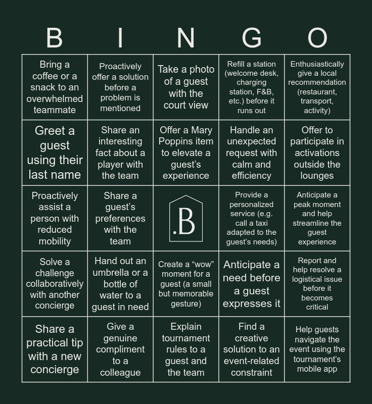 This bingo card has a free space and 24 words: Hand out an umbrella or a bottle of water to a guest in need, Give a genuine compliment to a colleague, Offer a Mary Poppins item to elevate a guest’s experience, Share a practical tip with a new concierge, Enthusiastically give a local recommendation (restaurant, transport, activity), Bring a coffee or a snack to an overwhelmed teammate, Greet a guest using their last name, Proactively offer a solution before a problem is mentioned, Provide a personalized service (e.g. call a taxi adapted to the guest’s needs), Create a “wow” moment for a guest (a small but memorable gesture), Handle an unexpected request with calm and efficiency, Proactively assist a person with reduced mobility, Anticipate a need before a guest expresses it, Report and help resolve a logistical issue before it becomes critical, Share an interesting fact about a player with the team, Find a creative solution to an event-related constraint, Anticipate a peak moment and help streamline the guest experience, Take a photo of a guest with the court view, Offer to participate in activations outside the lounges, Share a guest’s preferences with the team, Help guests navigate the event using the tournament’s mobile app, Solve a challenge collaboratively with another concierge, Refill a station (welcome desk, charging station, F&B, etc.) before it runs out and Explain tournament rules to a guest and the team.