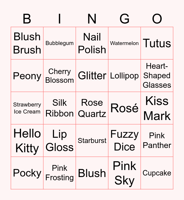 This bingo card has 50 words: Cotton Candy, Rose Quartz, Flamingo, Blush, Lip Gloss, Ballet Slippers, Bubblegum, Barbie, Peony, Strawberry Milk, Cherry Blossom, Watermelon, Pink Panther, Fuzzy Dice, Love Letter, Pinky Promise, Glitter, Rosé, Pink Lemonade, Tutus, Silk Ribbon, Pink Sky, Blush Brush, Lollipop, Petal, Cupcake, Heart-Shaped Glasses, Cherry Lip Balm, Nail Polish, Starburst, Piglet, Confetti, Crushed Velvet, Feather Boa, Pink Frosting, Mood Ring, Birthday Girl, Scented Eraser, Pastel Parade, Kiss Mark, Bubble Bath, Macaron, Daydream, Pink Hoodie, Pocky, Strawberry Ice Cream, Rosewater, Glow Stick, Hello Kitty and Pink Champagne.