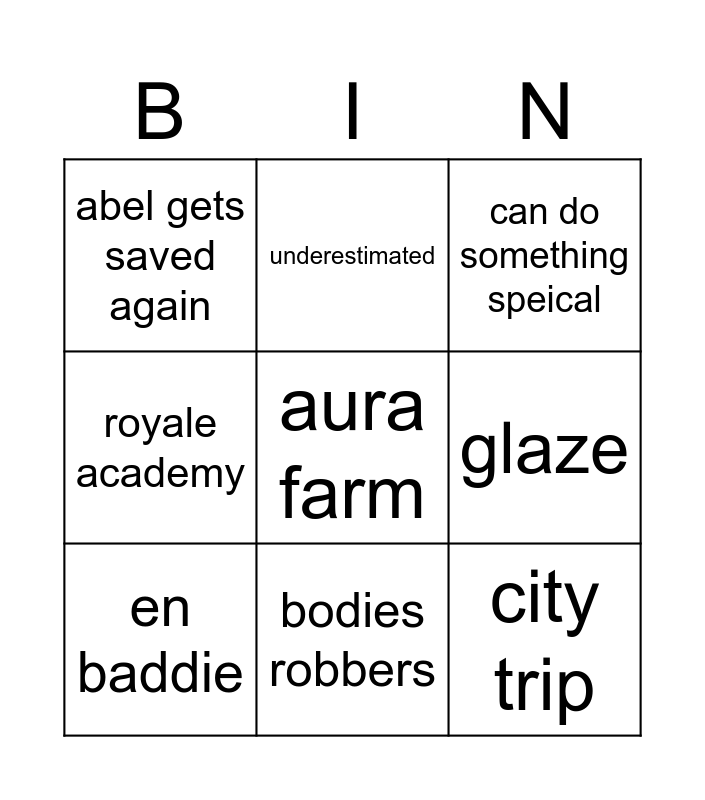This bingo card has a free space and 8 words: glaze, can do something speical, underestimated, en baddie, abel gets saved again, city trip, royale academy and bodies robbers.
