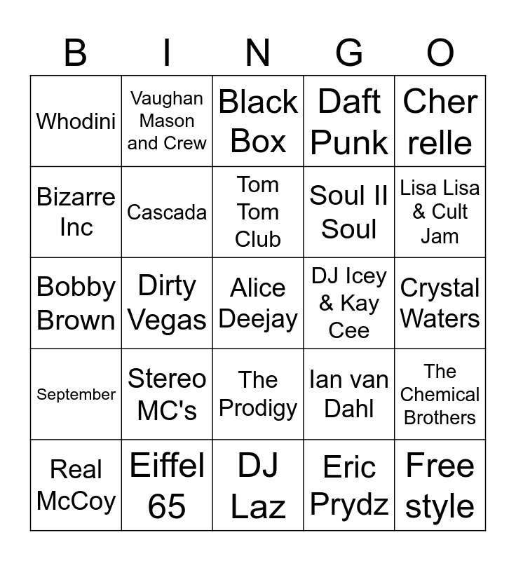 This bingo card has 35 words: La Rissa, DJ Sammy, Rockell, Cascada, The Prodigy, Daft Punk, Bizarre Inc, Nu Shooz, Tom Tom Club, Midnight Star, Bobby Brown, Cher relle, Deee-Lite, Daniel Beding field, Whodini, DJ Icey & Kay Cee, Eric Prydz, Dirty Vegas, September, Alice Deejay, Ian van Dahl, Real McCoy, The Chemical Brothers, Eiffel 65, Black Box, Lisa Lisa & Cult Jam, Free style, Nice & Wild, Soul II Soul, Crystal Waters, Le Tigre, DJ Laz, Stereo MC's, Vaughan Mason and Crew and Duice.