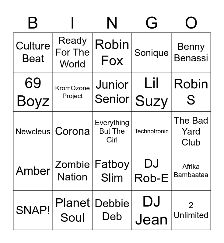 This bingo card has 36 words: DJ X, Sharaz, Jocelyn Enriquez, KromOzone Project, DJ Rob-E, Amber, Junior Senior, Basement Jaxx, Benny Benassi, Fragma, Corona, Sonique, La Bouche, Technotronic, Robin S, Culture Beat, 2 Unlimited, Zombie Nation, Everything But The Girl, Robin Fox, The Bad Yard Club, Afrika Bambaataa, Planet Soul, SNAP!, Debbie Deb, Ready For The World, Newcleus, Shannon, Lil Suzy, 69 Boyz, No Mercy, Darude, DJ Jean, Fatboy Slim, Sophie Ellis-Bextor and The Crystal Method.