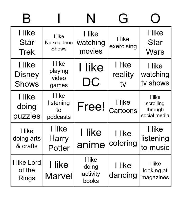 This bingo card has a free space and 24 words: I like Harry Potter, I like Marvel, I like DC, I like Lord of the Rings, I like Star Wars, I like Star Trek, I like Disney Shows, I like Nickelodeon Shows, I like Cartoons, I like anime, I like reality tv, I like doing puzzles, I like coloring, I like listening to music, I like playing video games, I like dancing, I like scrolling through social media, I like watching movies, I like watching tv shows, I like listening to podcasts, I like looking at magazines, I like doing arts & crafts, I like exercising and I like doing activity books.