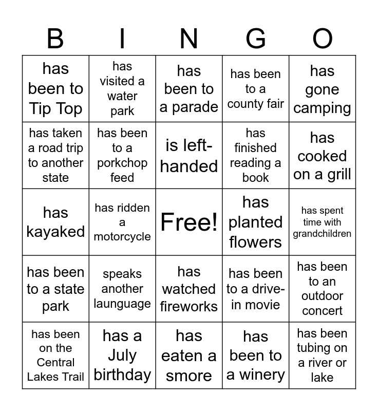 This bingo card has a free space and 24 words: speaks another launguage, has a July birthday, is left-handed, has been on the Central Lakes Trail, has gone camping, has been to Tip Top, has taken a road trip to another state, has visited a water park, has planted flowers, has watched fireworks, has finished reading a book, has kayaked, has been to a drive-in movie, has been to an outdoor concert, has been to a porkchop feed, has been to a winery, has spent time with grandchildren, has been to a parade, has cooked on a grill, has ridden a motorcycle, has been tubing on a river or lake, has been to a state park, has been to a county fair and has eaten a smore.