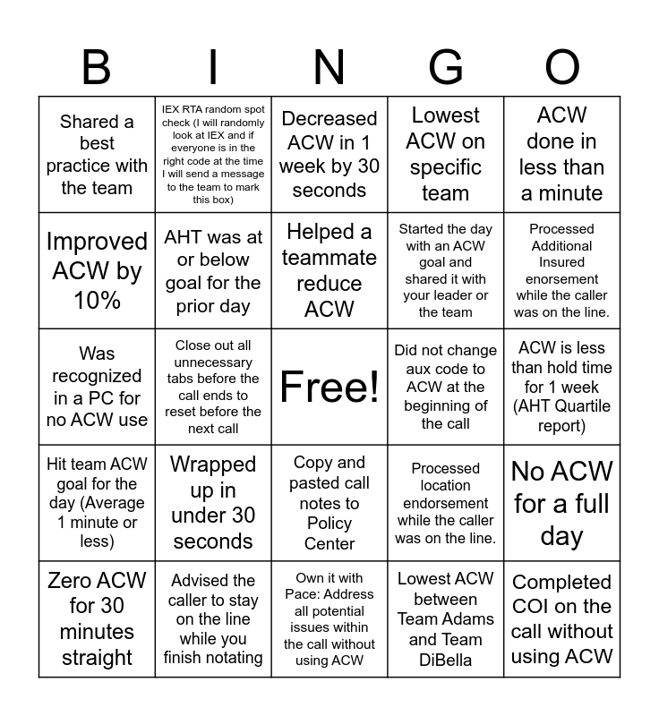 This bingo card has a free space and 24 words: Wrapped up in under 30 seconds, Advised the caller to stay on the line while you finish notating, Helped a teammate reduce ACW, Zero ACW for 30 minutes straight, ACW done in less than a minute, Shared a best practice with the team, Improved ACW by 10%, IEX RTA random spot check (I will randomly look at IEX and if everyone is in the right code at the time I will send a message to the team to mark this box), Did not change aux code to ACW at the beginning of the call, Copy and pasted call notes to Policy Center, Started the day with an ACW goal and shared it with your leader or the team, Was recognized in a PC for no ACW use, Processed location endorsement while the caller was on the line., No ACW for a full day, AHT was at or below goal for the prior day, Lowest ACW between Team Adams and Team DiBella, ACW is less than hold time for 1 week (AHT Quartile report), Decreased ACW in 1 week by 30 seconds, Processed Additional Insured enorsement while the caller was on the line., Close out all unnecessary tabs before the call ends to reset before the next call, Completed COI on the call without using ACW, Hit team ACW goal for the day (Average 1 minute or less), Lowest ACW on specific team and Own it with Pace: Address all potential issues within the call without using ACW.