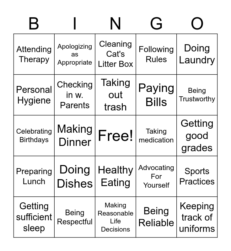 This bingo card has a free space and 38 words: Walking Dog, Cleaning Room, Doing Homework, Checking in w. Parents, Sports Practices, Doing Dishes, Taking out trash, Watching siblings, Doing Laundry, Paying Bills, Making Dinner, Following Rules, Keeping track of uniforms, Getting good grades, Personal Hygiene, Preparing Lunch, Waking up on time, Cleaning Cat's Litter Box, Feeding pets, Taking medication, Attending Therapy, Being Respectful, Being Trustworthy, Getting sufficient sleep, Healthy Eating, Making Reasonable Life Decisions, Respecting Teachers and Staff, Setting Goals, Studying For Tests, Yard Work, Participating In Class, Healthy Eating, Being Reliable, Apologizing as Appropriate, Attending Classes, Advocating For Yourself, Celebrating Birthdays and Follow Up on Missed Classes.