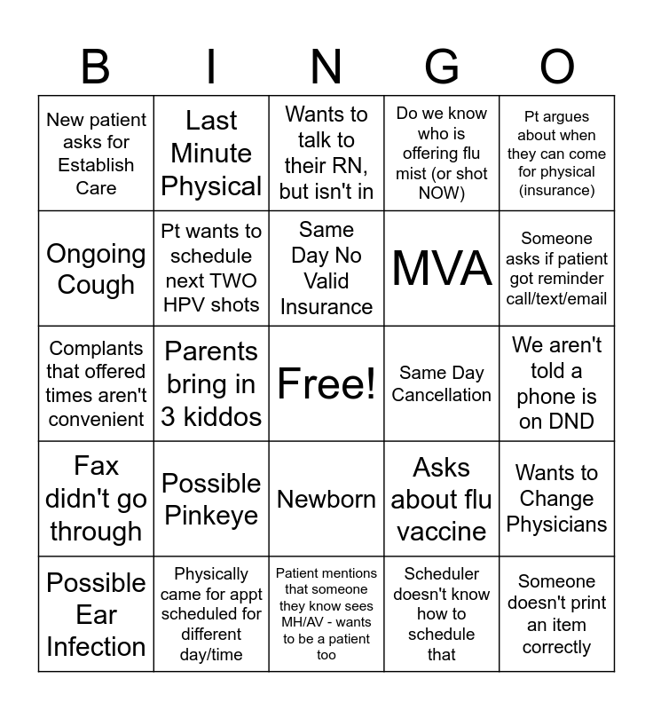 This bingo card has a free space and 24 words: Possible Pinkeye, Physically came for appt scheduled for different day/time, Same Day No Valid Insurance, Possible Ear Infection, Pt argues about when they can come for physical (insurance), New patient asks for Establish Care, Ongoing Cough, Last Minute Physical, Same Day Cancellation, Newborn, MVA, Complants that offered times aren't convenient, Asks about flu vaccine, Wants to Change Physicians, Pt wants to schedule next TWO HPV shots, Scheduler doesn't know how to schedule that, We aren't told a phone is on DND, Wants to talk to their RN, but isn't in, Someone asks if patient got reminder call/text/email, Parents bring in 3 kiddos, Someone doesn't print an item correctly, Fax didn't go through, Do we know who is offering flu mist (or shot NOW) and Patient mentions that someone they know sees MH/AV - wants to be a patient too.