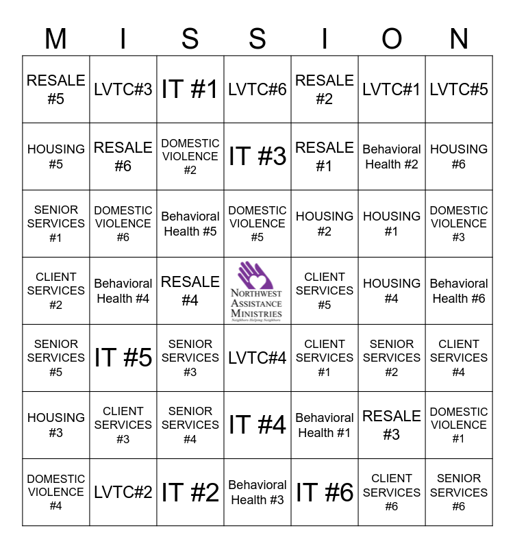 This bingo card has a free space and 48 words: Behavioral Health #1, Behavioral Health #2, Behavioral Health #3, Behavioral Health #4, Behavioral Health #5, Behavioral Health #6, LVTC#3, LVTC#2, LVTC#1, LVTC#4, LVTC#5, LVTC#6, HOUSING #1, HOUSING #2, HOUSING #3, HOUSING #4, HOUSING #5, HOUSING #6, RESALE #3, RESALE #2, RESALE #1, RESALE #4, RESALE #5, RESALE #6, DOMESTIC VIOLENCE #1, DOMESTIC VIOLENCE #2, DOMESTIC VIOLENCE #3, DOMESTIC VIOLENCE #4, DOMESTIC VIOLENCE #5, DOMESTIC VIOLENCE #6, CLIENT SERVICES #6, CLIENT SERVICES #5, CLIENT SERVICES #4, CLIENT SERVICES #3, CLIENT SERVICES #2, CLIENT SERVICES #1, SENIOR SERVICES #2, SENIOR SERVICES #1, SENIOR SERVICES #3, SENIOR SERVICES #4, SENIOR SERVICES #5, SENIOR SERVICES #6, IT #1, IT #2, IT #3, IT #4, IT #5 and IT #6.